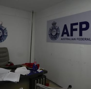 Inside one such compound, investigators described rooms staged to resemble offices of international law enforcement agencies, including the Australian Federal Police. These sets were reportedly used during video calls to convince victims they were dealing with legitimate authorities.